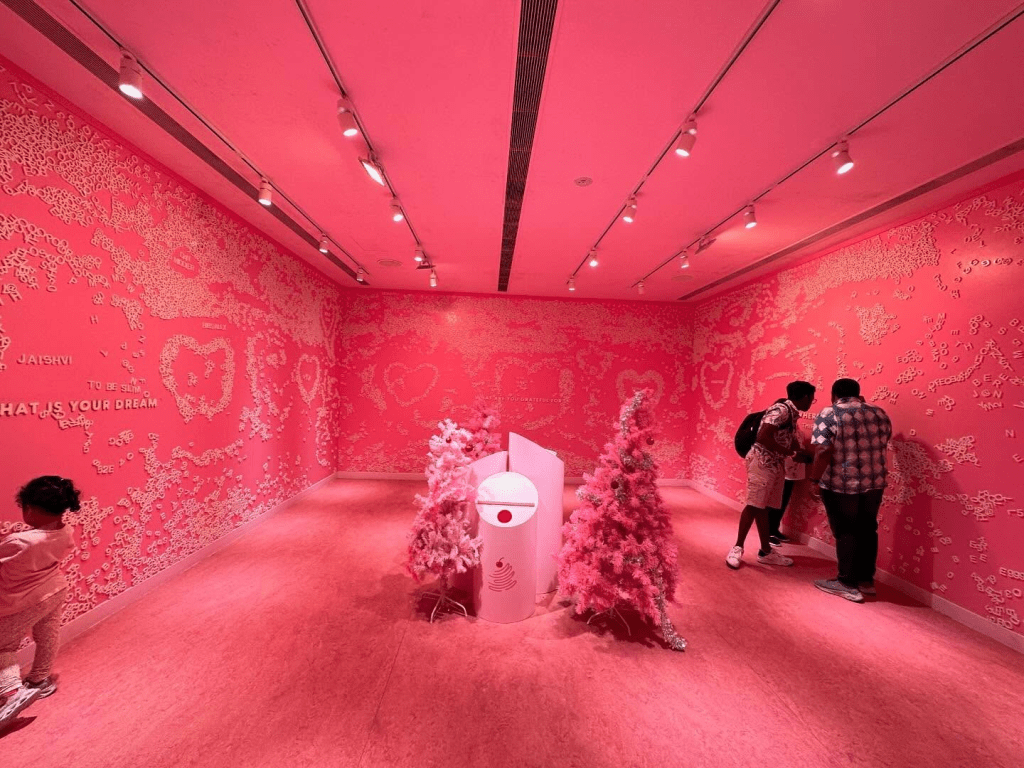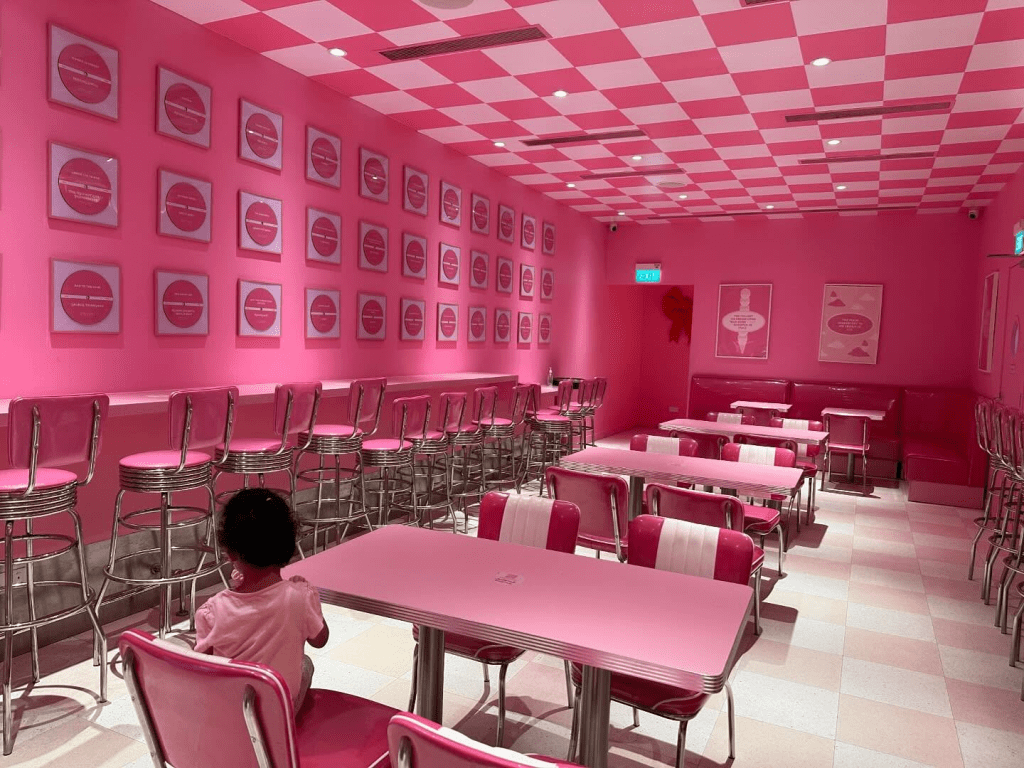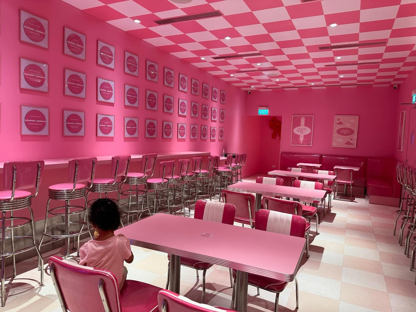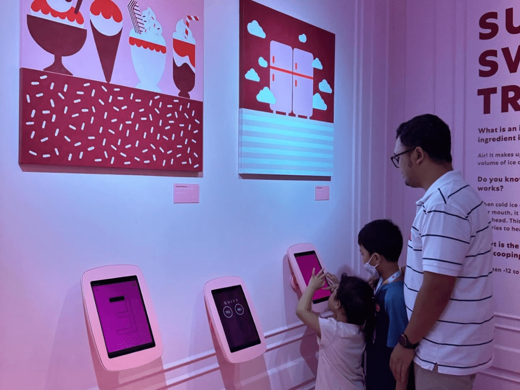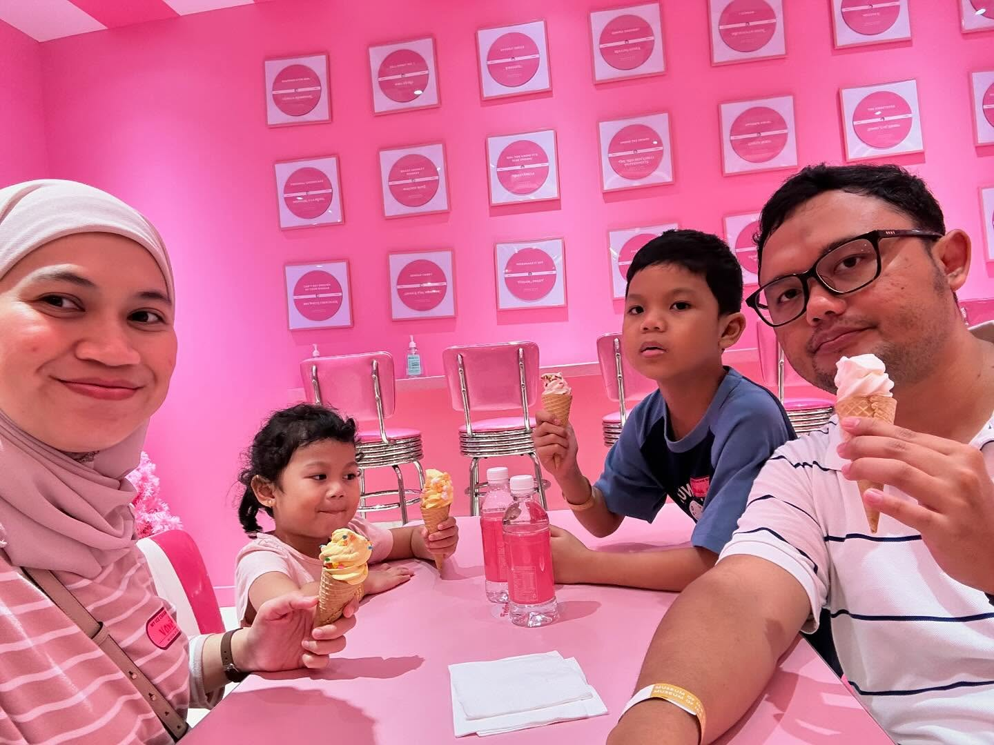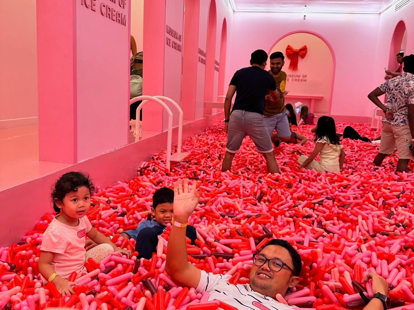Ruangan di dalamnya kira-kira ada 6 segmen, setiap ruangan ada temanya masing-masing dan semua nuansa pink. Di awal kita disuguhi pengetahuan-pengetahuan seputar eskrim, lalu ada ruangan yang isinya huruf-huruf yang ditempel di tembok dan kita bisa susun kata-kata sesuka kita. Terus ada ruangan yang ada sliding dan ayunannya, ada ruangan yang isinya lampu-lampu, pisang yang digantung, dan yang paling terkenal adalah kolam yang isinya es krim popsicle plastik seolah-olah kita berenang di eskrim.