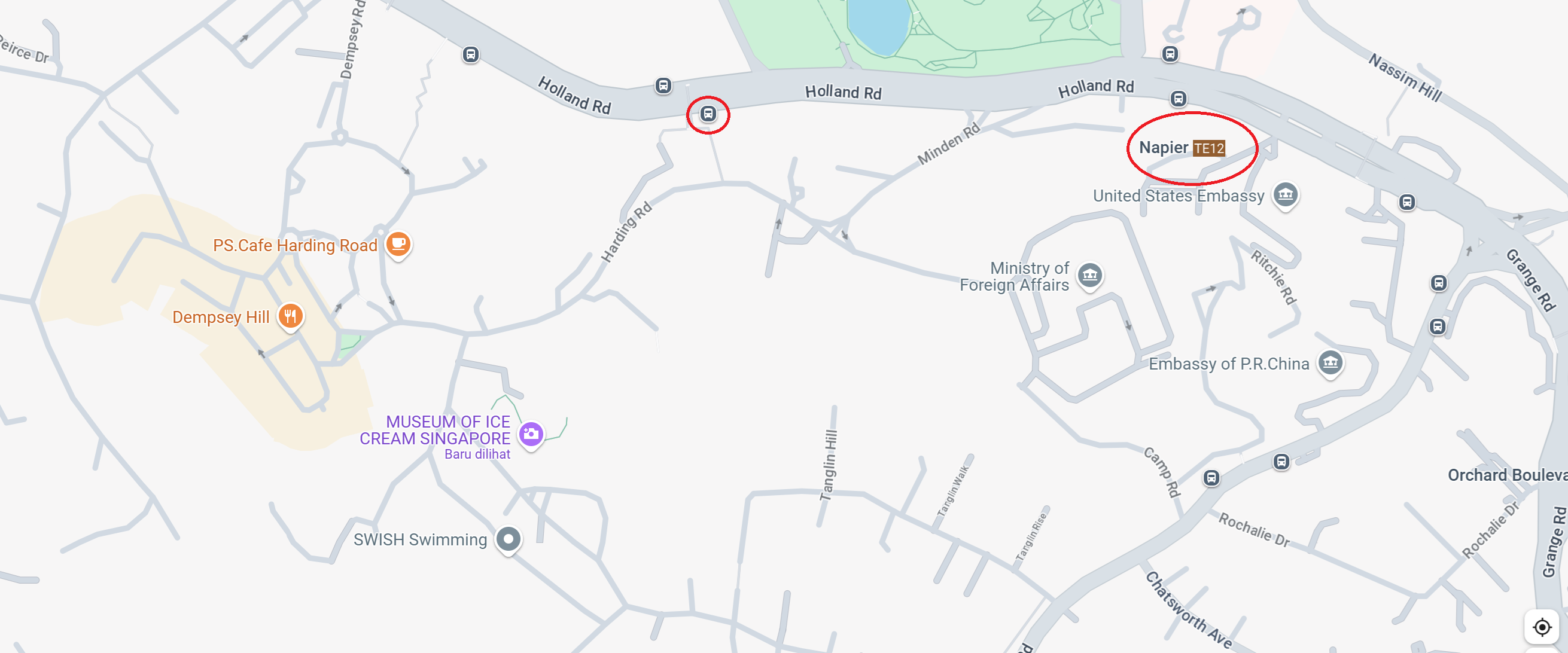 Lokasi MOIC ini letaknya di daerah perumahan, jauh dari mana-mana. Jalan termurah menuju ke sana naik kendaraan umum. Caranya kita perlu naik MRT Thompson-East Coast Line (TE) dan turun di Stasiun Napier. Setelah itu kita naik bus apapun yang lewat depan stasiun MRT nya (Holland Rd) dan turun hanya 1 halte saja. Dari halte ini, lumayan juga jalan kaki sekitar 400 meter sampai ke lokasinya.