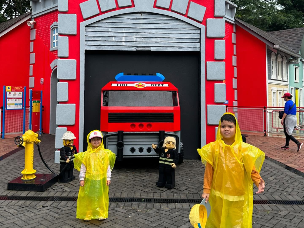 Tapi setelah makan siang, sekitar jam 2 siang, hujan berhenti namun kondisi masih mendung, pas hujan mulai berhenti, mulai banyak wahana-wahana outdoor yang dibuka kayak roller coaster, wahana outdoor lain kayak fireman, simulator lalu lintas, naik perahu di danau, dll mulai dibuka. Walau masih gerimis tapi ya namanya juga udah kepalang tanggung. Sambil pake jas hujan kuning ala legoland ya kita semua tetep main.