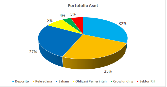 Sebaran investasi saya terdiri dari aset defensif yaitu 32% deposito berjangka dan 8% SBN. Aset moderat cenderung agresif (Reksadana) sebesar 25%, dan aset agresif yaitu saham sebesar 27%. Sisanya saya taruh di crowdfunding pertanian/peternakan dan menanam modal usaha peternakan joint venture dengan adik saya.