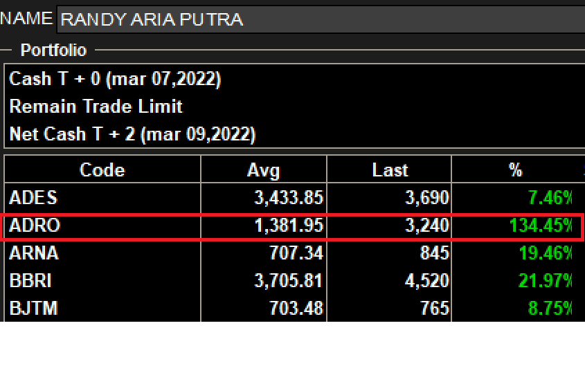 Lihat ADRO yang di kotak merah, sejak awal sampai akhir 2021, saat batubara mulai merangkak dari level 50 USD ke 80-an USD di Oktober 2021, harganya sideways dan bahkan cuma naik dikit. Padahal kita tahu, selama harga batubara 50 USD di 2020, ADRO tetap profit nggak rugi, hanya turun saja profitnya namun tetap bagi dividen. Dan lihat yang terjadi sejak Oktober 2021 sampai sekarang.. Boom!!! harganya meroket sampai hampir 2 kali lipat dong. And my patience has been paid off dong… Saya masuk ADRO sejak awal 2020 saat harganya sideways menuju ke bawah 2000 rupiah karena tertarik dividen yield nya. ADRO saya sempat nyebur ke 600 perak pas awal covid di Maret 2020 dan itu artinya dulu porto saya minus hampir 70% dong. Tapi apakah saya panik? panik lah masa nggak wkwk.. Cuma ya waktu itu saya ngga jual, banyak sabar aja sambil average down dengan sabar.