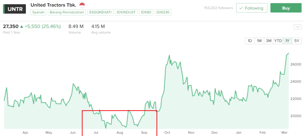 Grafik harga saham UNTR 1 tahun terakhir