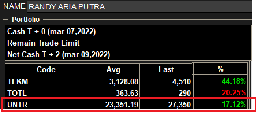 Periode gelap sebagai holder UNTR adalah di Q2 2021 dimana harga sahamnya nyungsep lagi dari 25ribu ke 18ribu. Kalau ngga salah hal ini terjadi karena PAMA sudah berhenti melayani ADRO dan digantikan BUMA, anak dari DOID (Delta Dunia Makmur). Hal ini yang bikin banyak investor out dari UNTR karena khawatir revenue stream nya anjlok. Tapi di saat itu saya tetap setia dan malah sempat nambah muatan di bawah level 20rb. Hasilnya, alhamdulillah sesuai kenyataan, walau %profit nya masih di bawah ADRO dan PTBA, tapi karena UNTR ini the biggest portion in my portofolio, dia naik 1% harganya, efeknya bisa lebih dari 3x kenaikan 1% ADRO dan PTBA.