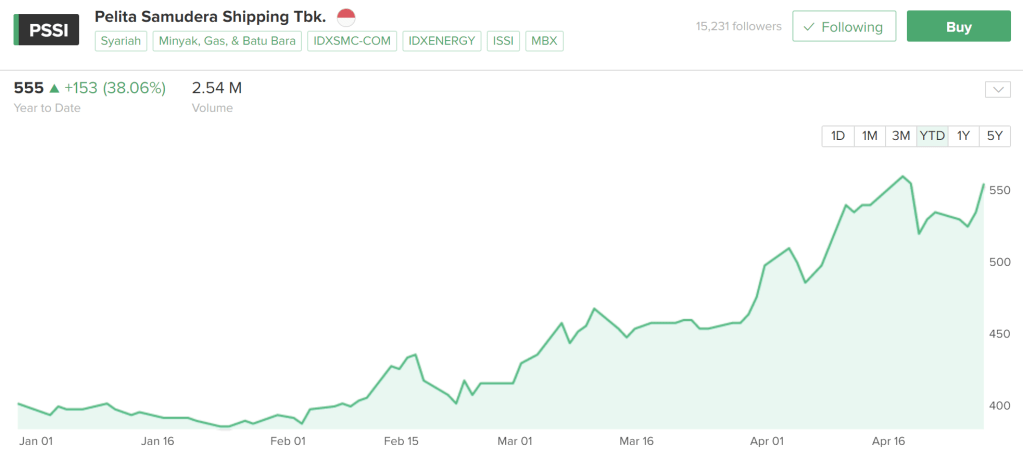 Emiten di porto saya yang kena imbas supercycle berikutnya adalah PSSI. Ya, PSSI, tapi bukan PSSI sepakbola ya. PSSI adalah kode emiten untuk PT Pelita Samudera Shipping, sebuah perusahaan jasa angkutan perkapalan yang beroperasi di wilayah Kalimantan Timur dan Kalimantan Selatan. Bisnis utamanya adalah angkutan batubara dan dalam 2 tahun ke belakang, perusahaan ini ekspansi dan diversifikasi untuk pengangkutan kargo curah dan komoditas lain seperti nikel.