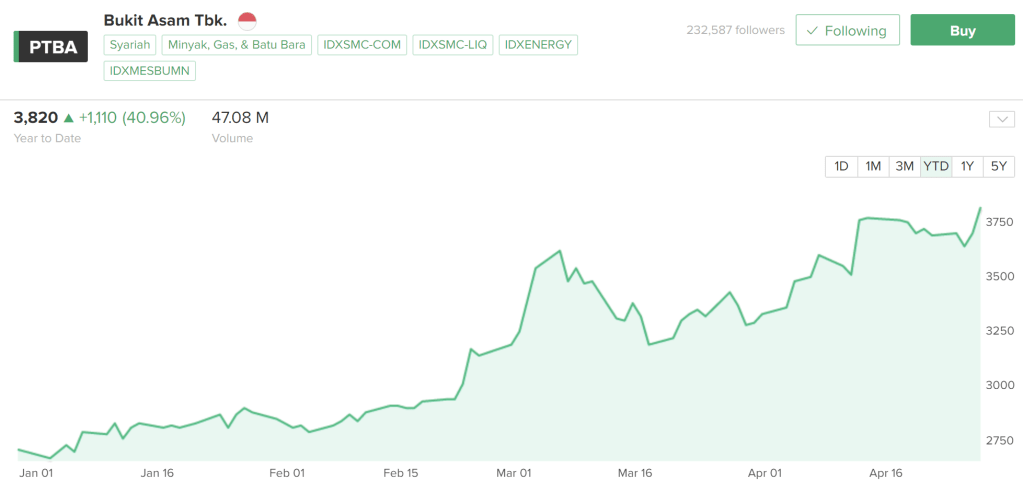 ADRO secara YTD sudah naik 48%, bahkan kalau ditarik lebih jauh ke 1Y, dia sudah menyentuh +166%. Luar biasa ya. Apalagi tanggal 27 April kemarin baru RUPS dan akan bagi dividen jumbo sebesar Rp 295 (interim Rp 160 sudah dibagikan). Ini menjadi rekor dividen tertinggi ADRO sepanjang masa.