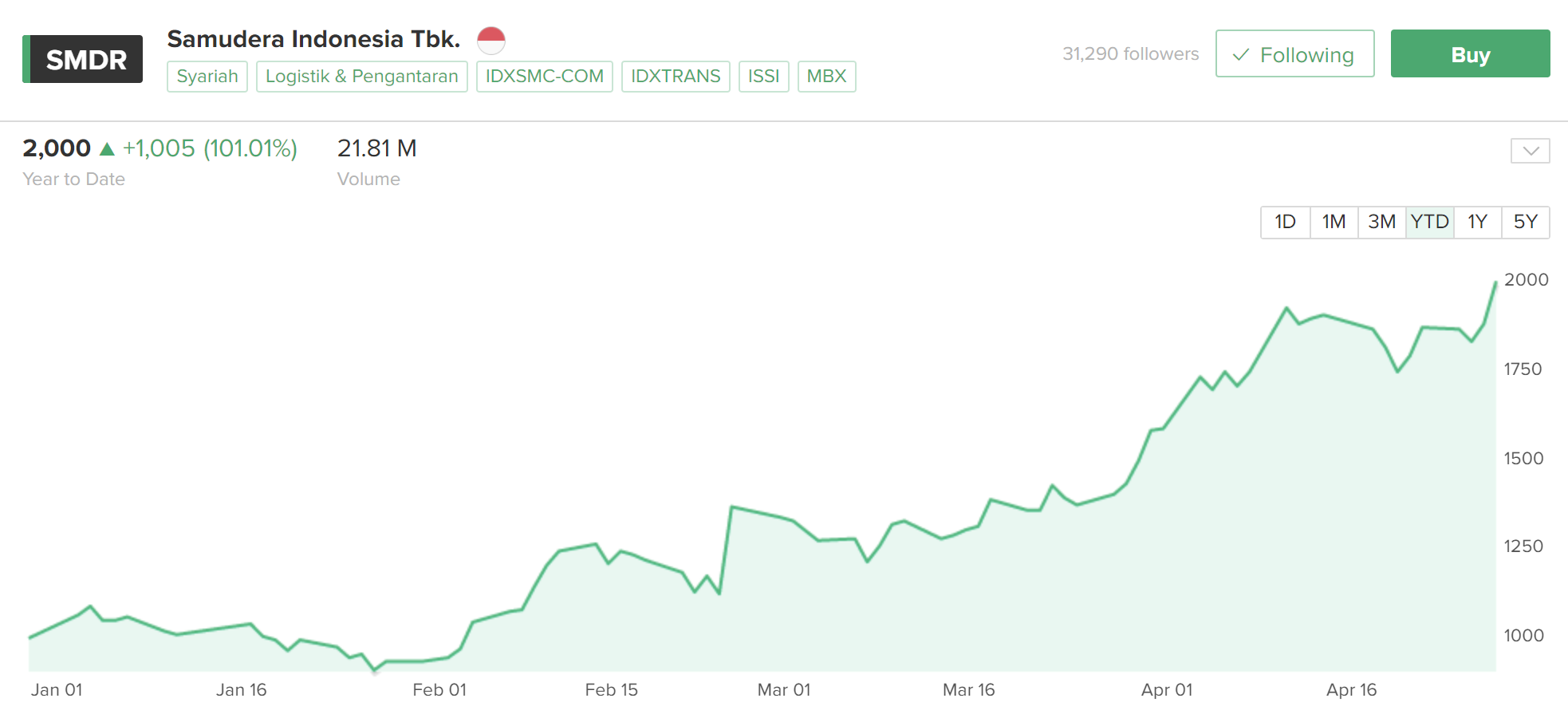 SMDR saham paling juara saya yang saat ini saya sudah floating profit hampir 200%, sayangnya porsi SMDR di porto masih kalah jauh dari porsi trio batubara. Kinerja SMDR yang sangat bagus di 2021 dan berlanjut di 2022 ini mendorong sahamnya dari harga 200-an ke 2000. Luar biasa ya. Sepertinya masih akan terdorong sentimen kinerja di Q2 ini dan akan bagi dividen jumbo di bulan Juni. kita lihat saja apakah mampu ke arah 3000 atau nggak? hehe