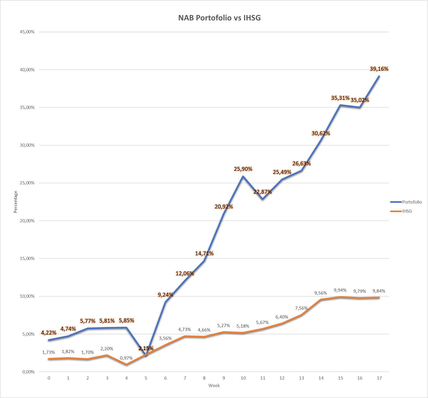 Kinerja YTD yang saya dapat di tahun ini sudah mencapai 39,16% as per hari penutupan bursa 28 April lalu. Ini makin jauh meninggalkan IHSG yang baru mencapai 9,84% secara YTD. IHSG saja udah memecahkan rekor dengan naik hampir 10% selama 4 bulan, apalagi kinerja porto saya.