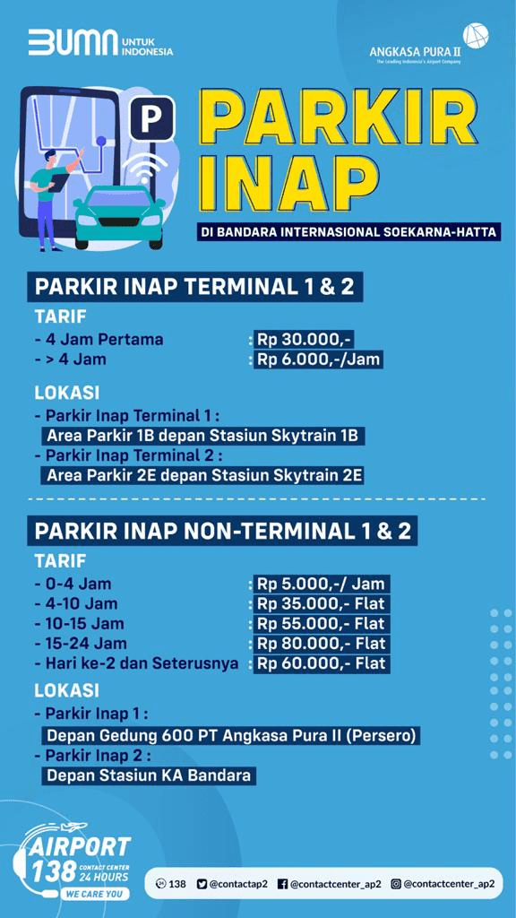 Saya putuskan untuk bawa mobil pribadi dari Bandung dan pakai parkir inap di Bandara Soetta. Sempat cari info kalau di Soetta itu ada lokasi parkir inap yang letaknya di terminal 1 dan 2 (di mana harganya mahal banget) dan yang lebih murah di luar Terminal yaitu di area gedung depan stasiun KA bandara, gedung 600 dan juga area Soewarna yang harganya lebih murah.