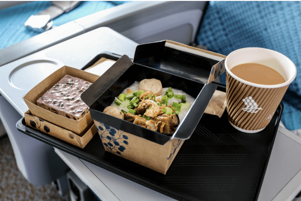 Ada yang berbeda kali ini, inflight menu yang biasa disajikan dalam nampan dan dengan peralatan lengkap sebelum pandemi, kali ini hanya disajikan dalam kotak karton ukuran kecil (mungkin 10×10 cm) namun isinya sangat padat dan mengenyangkan. Saya lupa ambil foto namun nemu di google berikut kira-kira penampakannya