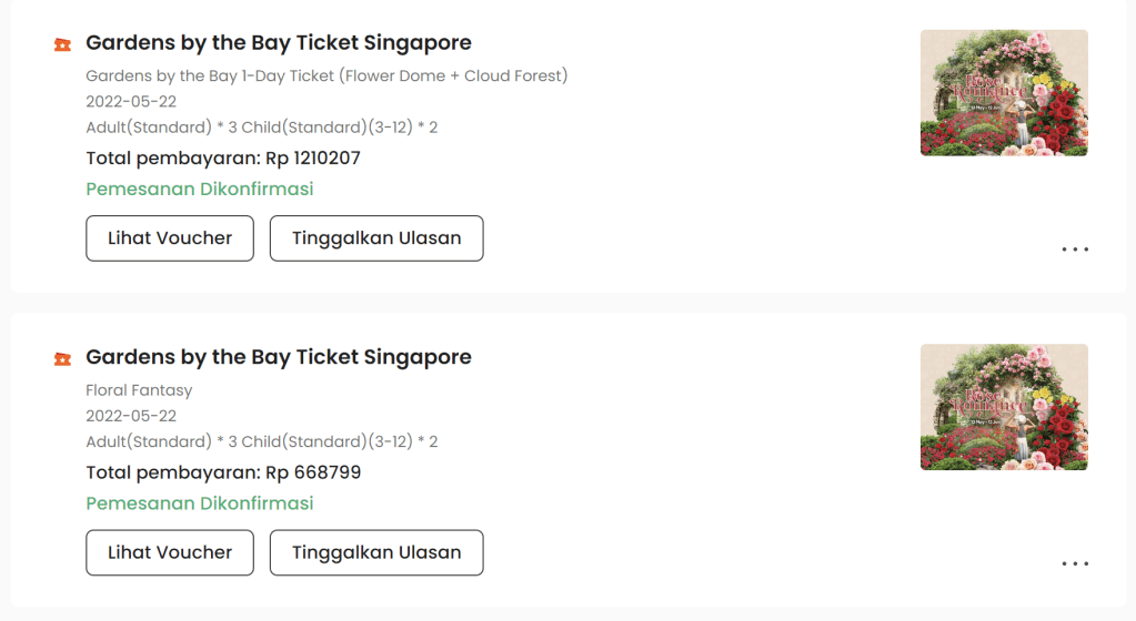Harga tiket masuk ke Flower Dome + Cloud Forest per orang sekitar Rp 400 ribuan (anak di bawah 3 tahun gratis). Sudah naik dikit sejak terakhir ke SG tahun 2019 dulu masih sekitar Rp 380 ribuan. Sedangkan tiket ke Floral Fantasy nya sekitar Rp 170 ribuan.