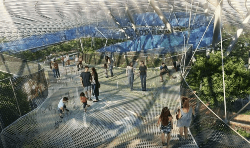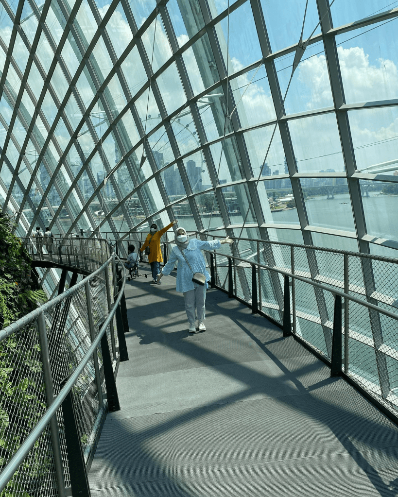 Nah, dari Floral Fantasy yang letaknya dekat dengan pintu keluar stasiun MRT, untuk menuju ke Garden by The Bays tempat Cloud Forest, Flower Dome dan Sky Tree, kita perlu jalan kaki sekitar 500-an meter melintasi danau via jembatan di sana. Di tengah hari bolong di cuaca SG yang saat itu sekitar 32 derajat celcius, sangat disarankan bawa payung agar tidak terlalu kepanasan.