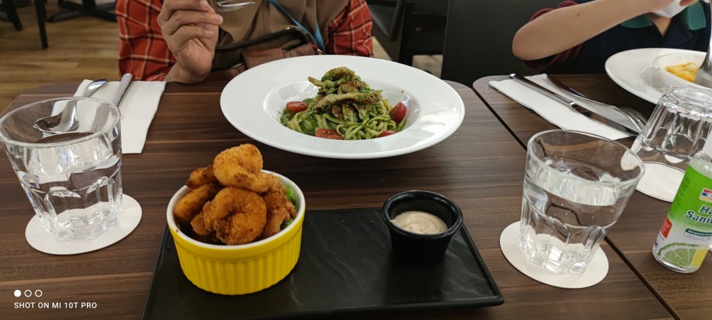 Karena anak-anak sudah makan sereal dan kue yang dibawa dari Indonesia di hotel tadi, akhirnya kami pesan menu yang bisa dimakan ramai-ramai seperti Mozarella cheede balls, Margherita, Wild Mushroom Linguine, Mac & Cheese buat bocah, dan Amalfi Grilled Chicken. Seperti halnya di negara maju lainnya, air putih disediakan secara gratis dan bisa refill tanpa limit hehe.