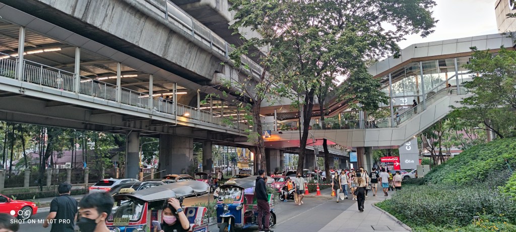 Karena istri saya mabok dan mual-mual, maka kami istirahat sebentar di luar stasiun BTS buat ambil nafas dan duduk. Sekitar pukul 7, istri sudah baikan dan kita memutuskan untuk jalan ke JODD Fair, sebuah kawasan pasar malam yang isinya bar dan beberapa tempat makan gitu hasil dari nontonin video salah satu yutuber. Dari Siam naik BTS 3 stasiun lalu lanjut naik MRT yang kebetulan satu jalan dengan arah pulang ke hotel. Pengalaman di stasiun BTS yang supercrowded dan masuk ke kereta yang crowded bener-bener khas Bangkok dah.