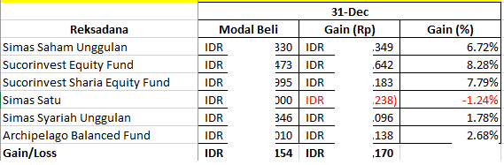 Nilai rupiahnya saya tutup lagi hehe. Terlihat penyumbang return terbesar ada di RD Sucorinvest Equity Fund dengan 8.28% dan 1 RD memberi return negatif (Simas Satu).