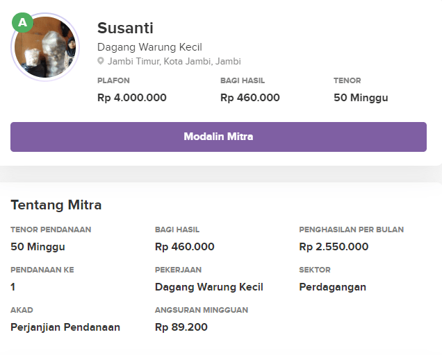 Si P2P ungu yang satu ini punya misi sosial yang bagus, yaitu meng-empower emak-emak di desa agar bisa menjalankan usaha mikro buat menambah penghasilan keluarga. Mengingat amar*ha sudah berdiri sejak 2016 dan semakin tumbuh, saya pun coba peruntungan di sini sejak tahun 2020 awal. Perlu diingat, di sini ada lebih dari 100 mitra (istilah lain lender) yang mengajukan proposal peminjaman dana. Kita harus pintar-pintar memfilter mana yang masuk ke dalam kriteria lender yang “sehat” dan bisa bayar cicilan per bulan.