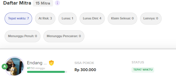 Sampai saat ini saya sudah danai 15 mitra, dan statusnya adalah 7 masih berjalan, 1 lunas sampai akhir tenor, 4 lunas dini (mitra boleh melunasi dini pinjamannya, sehingga dia ngga perlu bayar sisa bunga nya), 1 meninggal (dianggap lunas dini) dan 2 at risk (ada salah ketik di websitenya, harusnya lunas dini 5, at risk 2) karena punya keterlambatan cicilan lebih dari 3 kali.