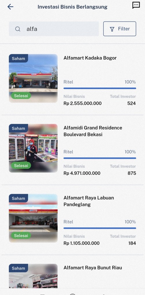 Saya sudah ikut 4 proyek alfamidi di si biru. Lokasinya di bekasi 2, pandeglang dan tangerang. So far sudah jalan 2-3 bulan dan dari 4 itu hanya 1 yang masih merugi. Sisanya sudah bagi dividen meski yield hanya 0.5% per bulan atau estimasi 6% per tahun. Lumayan lah masih lebih tinggi dari deposito. Kita lihat bagaimana kelanjutan bisnisnya.