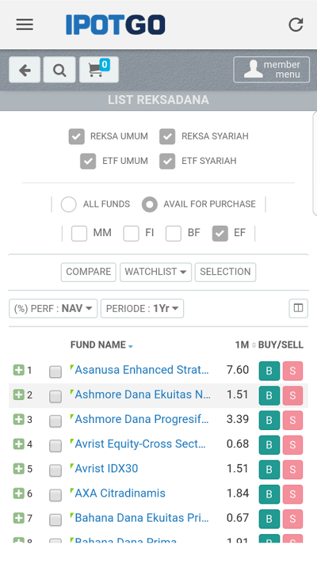 Di IPOT kita bisa melakukan pembelian Reksadana maupun saham. Karena saya hanya menggunakan IPOT untuk membeli RD saja, maka saya kenalkan menu-menu nya. Seperti sudah disinggung sebelumnya, ada ratusan RD yang tersedia di IPOT. Masuk saja ke menu List Reksadana dan coba lakukan filtering sendiri dengan mudah untuk mem-filter jenis reksadana, performa kurun waktu RD, dll.