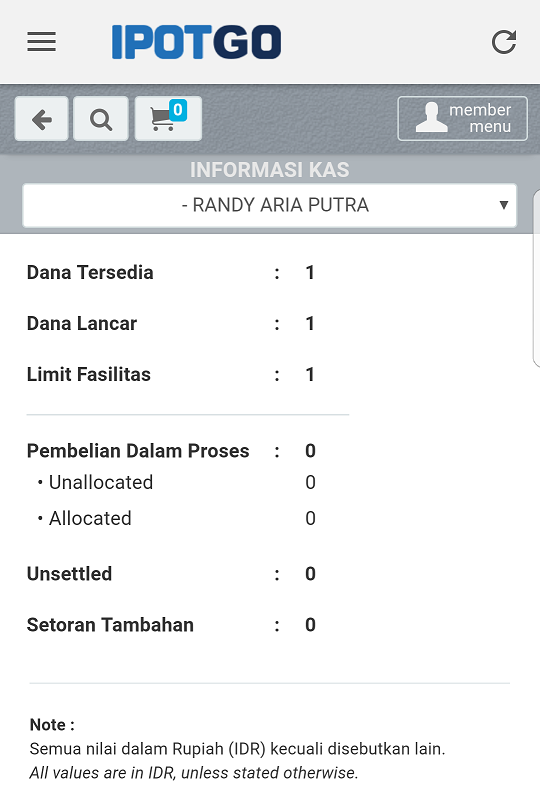 Di IPOT ada fitur cash info yang menampilkan berapa posisi kas di akun RDN kita. Tinggal klik saja menu Member Menu –> Info Rekening –> Informasi Kas.